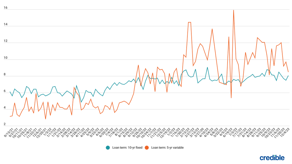 During the week of Dec. 4, 2023, average private student loan rates spiked for borrowers with credit scores of 720 or higher who used the Credible marketplace to take out 10-year fixed-rate loans and fell for those who took out 5-year variable-rate loans.