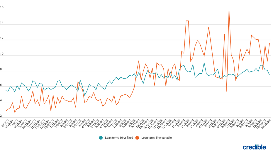 During the week of Oct. 30, 2023, average private student loan rates fell for borrowers with credit scores of 720 or higher who used the Credible marketplace to take out 10-year fixed-rate loans and rose for 5-year variable-rate loans.